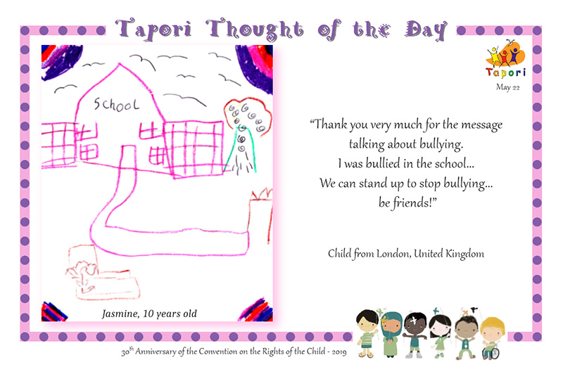 Jasmine, age 10, wrote to Tapori to say how important it is that children help each other stand up to bullying: