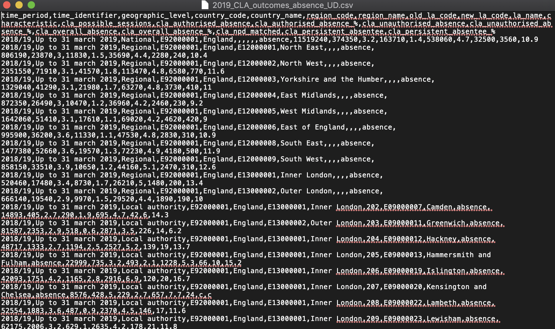 This is what I mean when I say the data is ‘available’ but not ‘accessible’. I’m sure when I first saw files like this I had a little panic attack and felt like I’d never find the data I needed. This barrier becomes more and more insurmountable as you try to find data required to answer more complex questions, such as looking at how something has changed over time, or how strongly related it is to another piece of data in a different file.