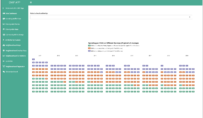 The two images above show the welcome page of the Child Welfare Inequalities Project App and the “Spending Waffle Plots” tab.