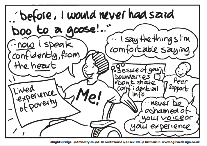 Patricia: It’s true that having a peer support network before you speak out means we can help each other to say no when we’re not comfortable with the way a question is asked. We can think about what our own boundaries are. It can be nerve-wracking to meet new people from a different background, but now I realise that when we go some place new, the people we meet are sometimes nervous about meeting people with lived experience of poverty too.