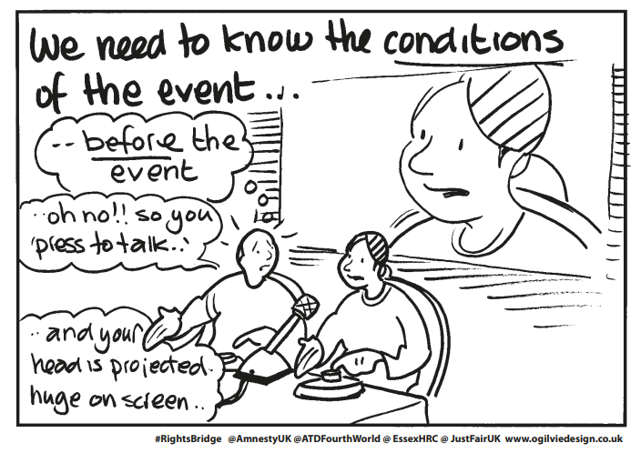 When you’re talking from your own experience, pace matters and it’s also important to be able to protect your own boundaries. Last winter I supported a woman who decided to speak publicly about the impact of poverty on the right to family life. She was so angry about how the child protection system violates families’ rights that she wanted to speak out to make a difference — but then while she was speaking, she ended up talking about things that need to be confidential to protect her children. Next time, I told her she should prepare in advance to be sure about her own boundaries so that she doesn’t get in trouble. There can be serious consequences when things go wrong.