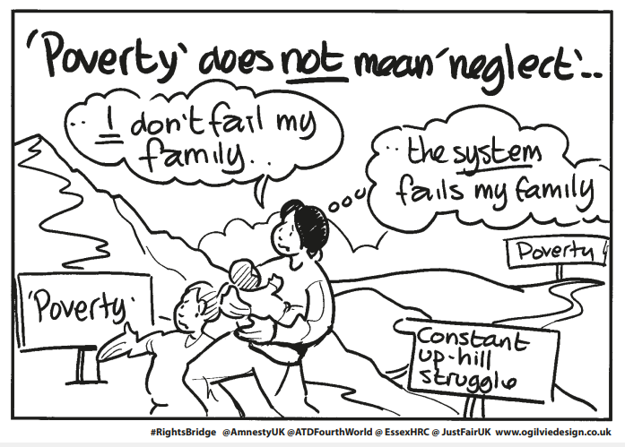 On 5 July 2021, a fourth webinar took place to conclude the series called “Building a human rights bridge out of poverty”. Co-organised by ATD Fourth World with Amnesty International, Just Fair and the University of Essex Human Rights Centre, this series began last January and has included talks about the impact of poverty on the right to family life, and about human rights education, and the rights of people seeking asylum. The goal of this series has been to consider how to contribute to the United Nations review of the UK’s compliance with ICESCR, the International Covenant on Economic, Social and Cultural Rights.